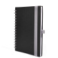 Notes 14x21 cm s gumicom i spiralom Bergo wire A5 crni opseg: 192 stranice dimenzija 14,9 x 20,6 cm, vrsta papira: 80 g/m2 listovi uvez: spiralni, tvrdi uvez, praktični dvostrani džep, gumica (15 mm) i gumica za olovku, Korica je izrađena od eko kože, preporučena vrsta tiska: sitotisak, foliotisak, termotisak i UV tisak.